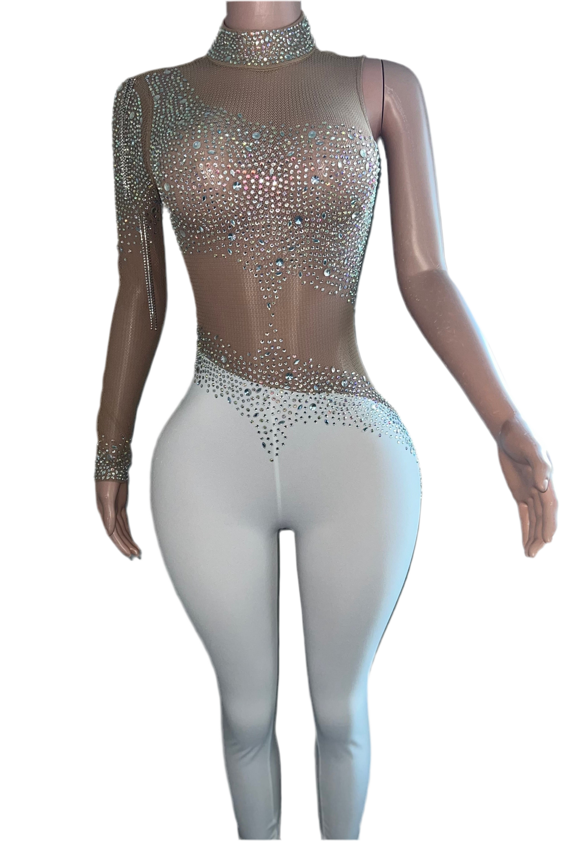 Nude and white jumpsuit with one sleeve bedazzled in rhinestones