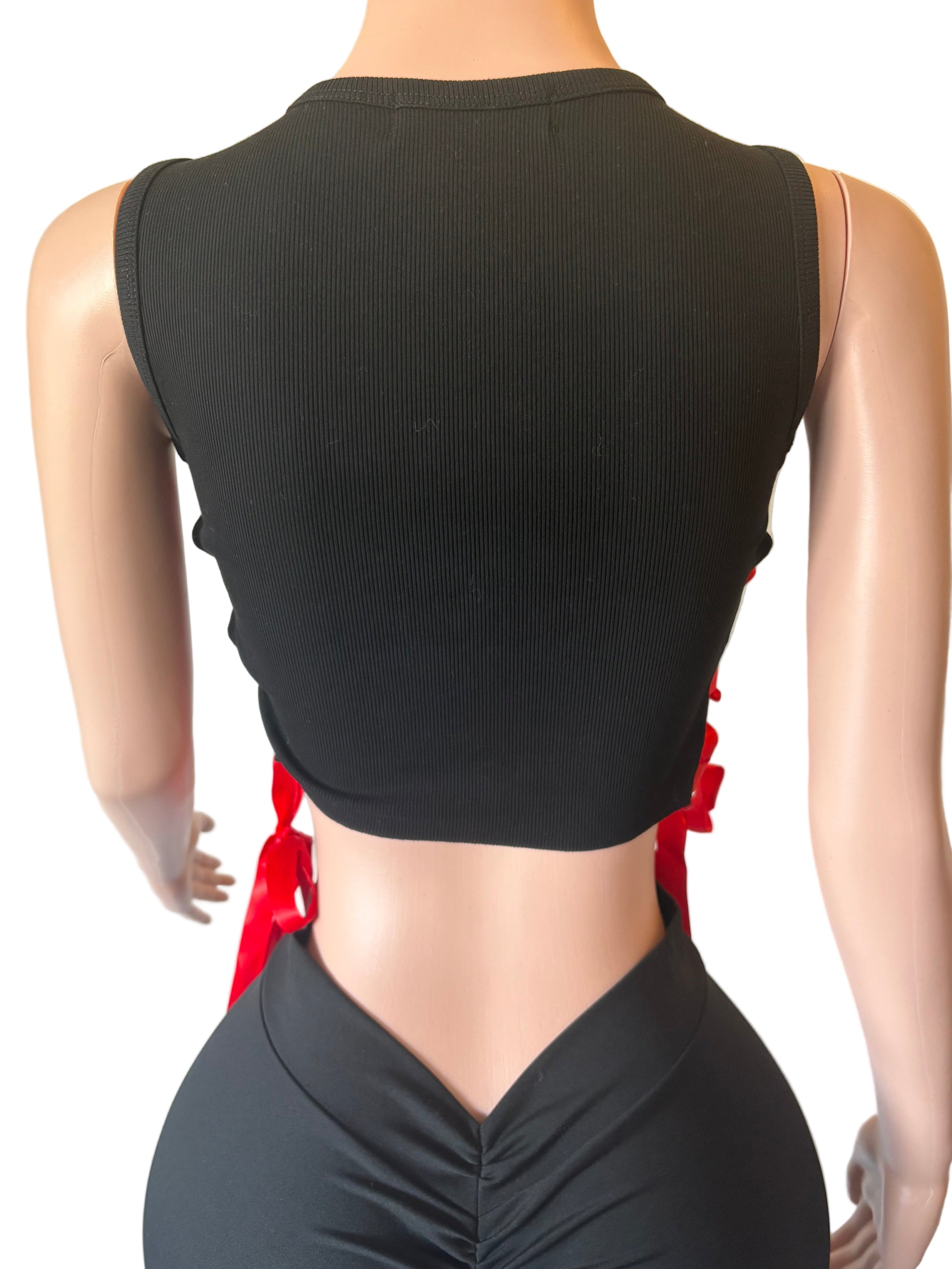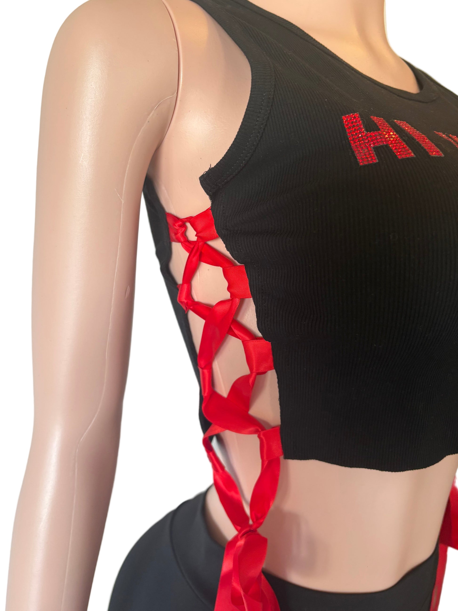 Black/Red "Hi Hater" tank top with rhinestones, silk strings
